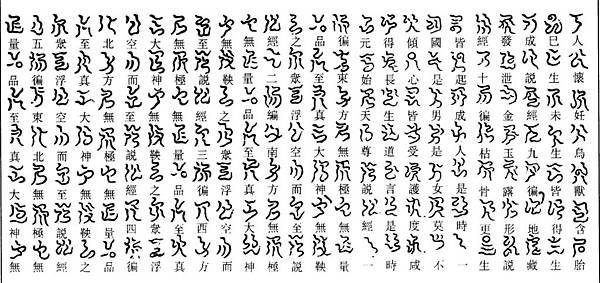 在道教中有一種非常獨特的文字,叫雲篆。用雲篆寫的經文,也稱之為元始天書。字體似篆,而筆畫多曲疊。謂由天空中的雲氣轉化而成,故此得名。在《雲笈七籤》中記:「八龍雲篆,明光之章,自然飛玄之氣,結空成文,字方一丈,肇於諸天之內,生立一切也。篆者撰也,撰集雲書,謂之雲篆。此即三元八會之文,皆是天書也。」
