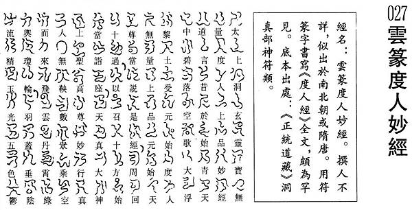 《道藏》中的《雲笈度人妙經》後加以繁化,用以書寫符籙,用來遣神、役鬼、治病。