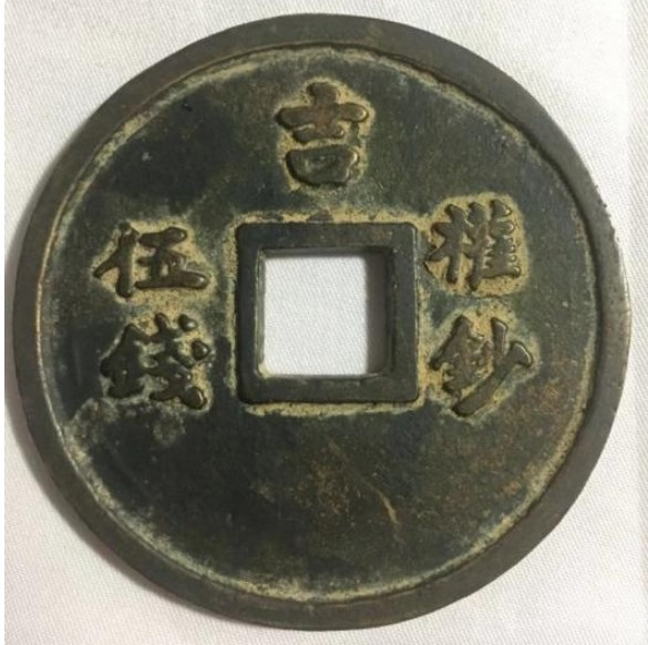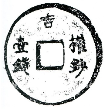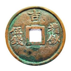 近日,筆者有幸一睹該寶真容。該銅錢為元代惠宗(順帝)至正十年(公元1350年)起鑄造的圓形方孔大銅錢,直徑7.95厘米,厚0.66厘米,重153克。正面為對讀楷書「至正之寶」四個大字;背面上方有一個「吉」字,穿孔右邊豎寫「權鈔」、穿孔左邊豎寫「伍錢」。「吉」字系指江西吉安,表明該錢鑄造於江西省。穿孔右「權鈔」兩字可作銀鈔解,穿孔左邊的「伍錢」為幣值,即該錢等值銀鈔半兩,或銅錢五百文。該錢乃元朝所鑄直徑最大的流通方孔銅錢。
