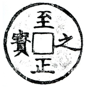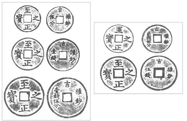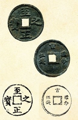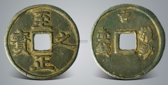 元朝順帝,至正年間(公元1341-1368)鑄造。均為大錢,用以代表交鈔與紙幣並行。錢體厚重,製作精良。有折十,二十,三十,五十等幾型。面文「至正之寶」為端麗楷書,直讀。背穿上「古」系記江西吉安道監製;穿右「權鈔」二字可作權當銀鈔解。