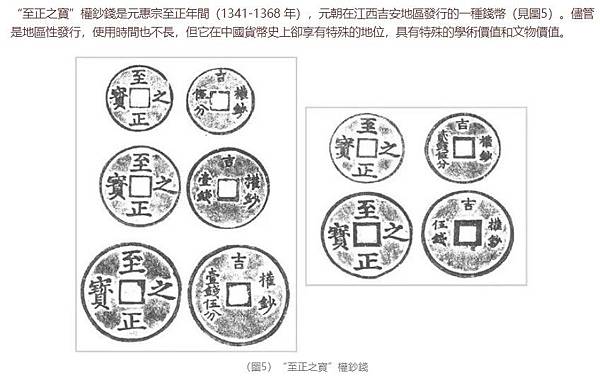 “至正之寶”權鈔錢是元惠宗至正年間(1341-1368 年),元朝在江西吉安地區發行的一種錢幣(見圖5)。儘管是地區性發行,使用時間也不長,但它在中國貨幣史上卻享有特殊的地位,具有特殊的學術價值和文物價值。