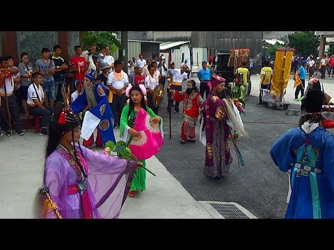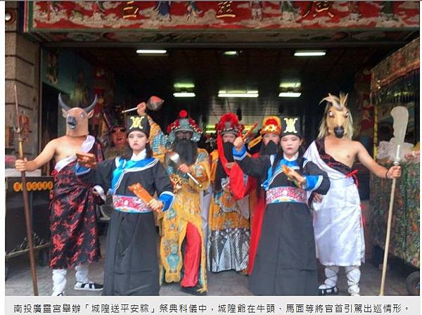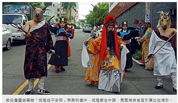 南投廣靈宮舉辦「城隍送平安粽」祭典科儀中,城隍爺在牛頭、馬面等將官首引駕出巡情形。(記者謝介裕翻攝)