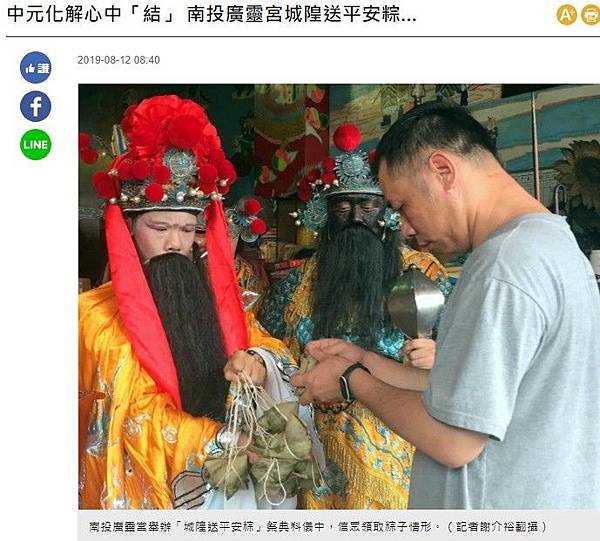 分享中元化解心中「結」 南投廣靈宮城隍送平安粽…到Facebook 分享中元化解心中「結」 南投廣靈宮城隍送平安粽…到Line