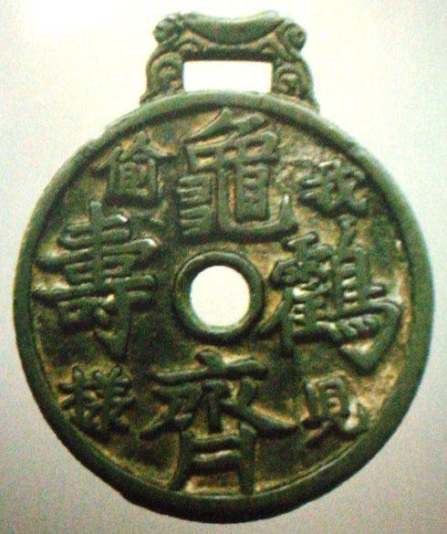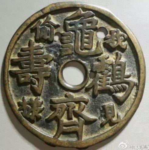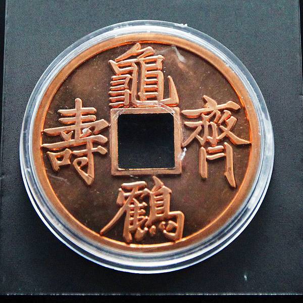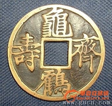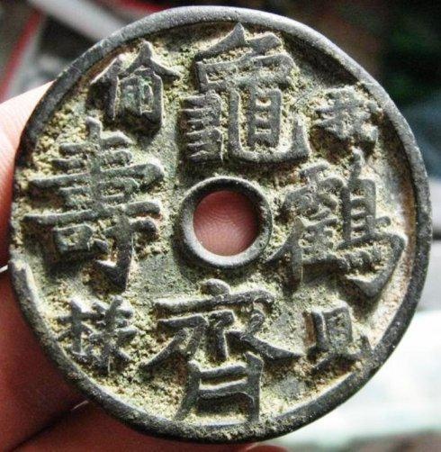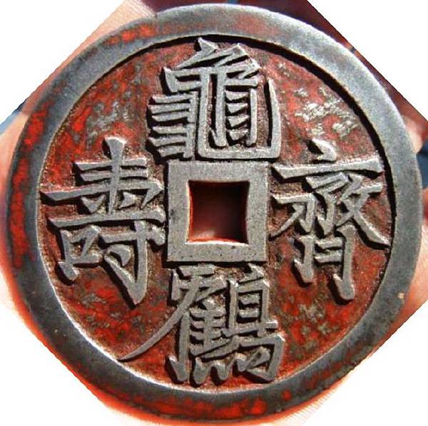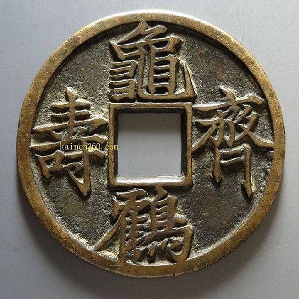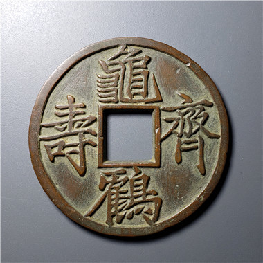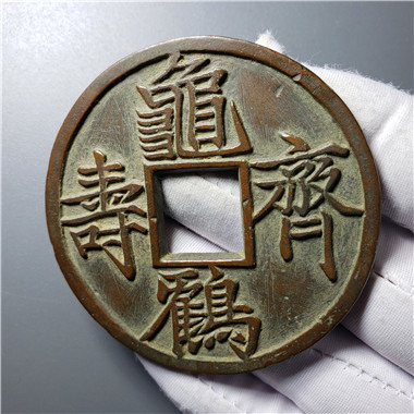 「龜鶴齊壽」是厭勝類的吉語錢。它表達的是一種人們對生命狀態的期望,寄託的是對生命指數的神往,其應是人們意念里傳說中的「千年龜、萬年鶴」。用以祝壽,用以饋贈,及自我佩戴,則表示一種理念,一種自我安慰,一種暗示和禱告。