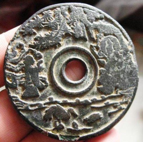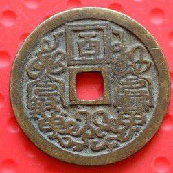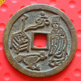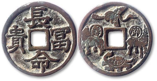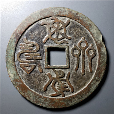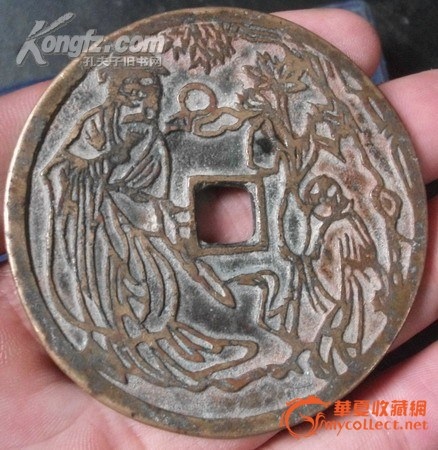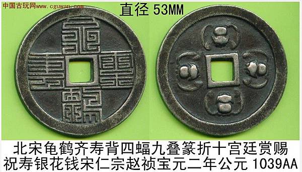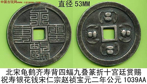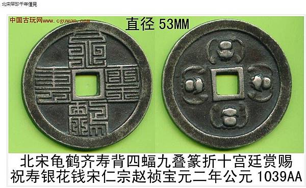 龜鶴齊壽可以說是宋代吉語花錢的代表作,錢文讀「龜鶴齊壽」,書法有瘦金意味,傳為宋徽宗手筆。這錢有多種大小版本,多為51毫米左右。這枚是少見的大版,達54毫米。美國的張宗子先生藏有一枚更大版,可能達55毫米。最大的莫過於天津藏家的一枚,直徑80多毫米,應該是此錢的特鑄版,迄今未見第二枚,是為孤品。1998年我專訪西雅圖一錢商,見龜鶴齊壽鐵錢一枚,徑逾200多毫米,筆觸鐵劃銀鉤,令吾心動。可惜那錢被人預訂,未能攜返倫敦。那枚鐵錢後來回流中國,不知花落誰家。