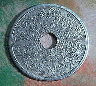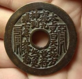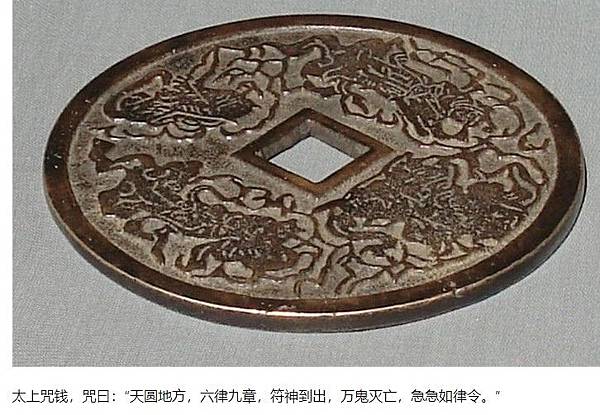 太上咒钱,咒曰:“天圆地方,六律九章,符神到出,万鬼灭亡,急急如律令。”
