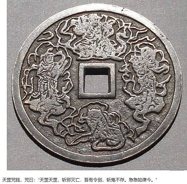 💗道家祈禳之法物。如天罡咒錢,咒曰:「天罡天罡,斬邪滅亡,吾有令劍,斬鬼不存。急急如律今。」、太上咒錢,咒曰:「天圓地方,六律九章,符神到出,萬鬼滅亡,急急如律令。」、五雷錢,咒曰:「雷霆八部,誅鬼降精,斬妖辟邪,永保神清,奉太上老君,急急如律令,敕。」這些錢背均鑄八卦、仙人、太上老君、雷部正神等。