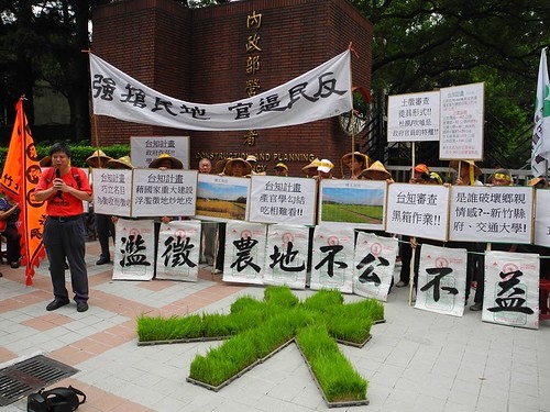 特地從新竹北上的多位農民,在正中午時刻仍然不畏大太陽,在內政部營建署前高喊口號,不滿民國84年,科管局因為農民抗議,已經放棄徵收的竹科三期案,新竹縣政府卻在去年,以變更特定區計畫重啟徵收,當地居民痛批政府強徵民地。