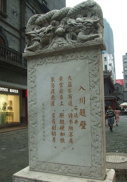 成都科甲巷石達開紀念碑(石達開被處死之處),碑上詩刻為後人偽托石達開之名而作。(AlexHe34/維基百科)