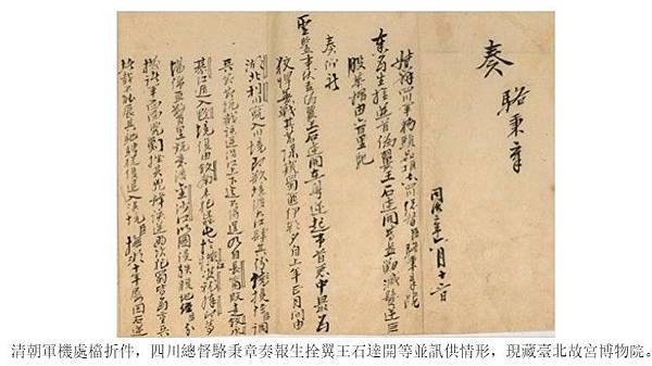 清朝軍機處檔折件,四川總督駱秉章奏報生拴翼王石達開等並訊供情形,現藏臺北故宮博物院。(公有領域)
