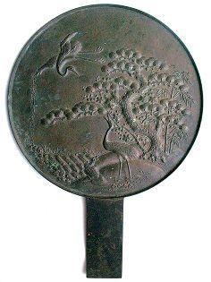 在筆者收藏的古代銅鏡中,有一枚日本蓬萊紋柄形鏡(俗稱「和鏡」)較有藝術價值。該鏡通長33.5厘米,圓形鏡徑23.8厘米,窄邊直緣,鏡體較薄。鏡背紋飾未設界區分隔,在均勻的粟米狀地紋上,用淺浮雕的手法鑄塑一幅由龜鶴松竹組成的洲濱風景圖。