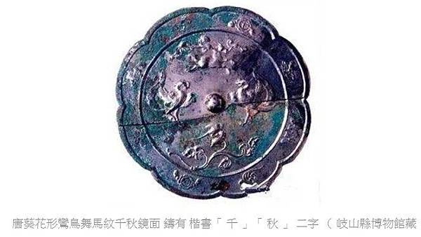 唐葵花形鸞鳥舞馬紋千秋鏡面 鑄有 楷書「 千 」「 秋 」 二字 ( 岐山縣博物館藏