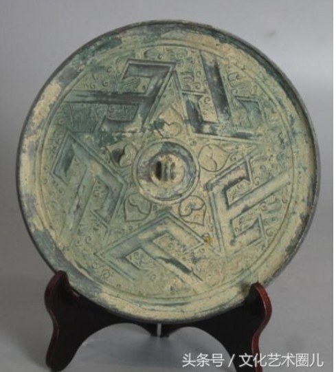 鏡版工極為細膩,底紋清晰無比,尺寸較大,惜裂修。其邊緣飾以五瓣葉紋作為等分基點,近緣處有相同五瓣葉紋與基點相對。葉有像徵性的葉莖和葉脈。主題紋飾為五個山字環繞鏡鈕,山字紋飾圍繞鈕座形成了一個五角星形,山字形外框鑲有邊緣沿。五個山字形排列整齊,間距基本相等。空隙處以羽狀紋飾為填充,狹緣上卷,鏡面平坦。此鏡內外環形帶皆拋光處理,版模一流。