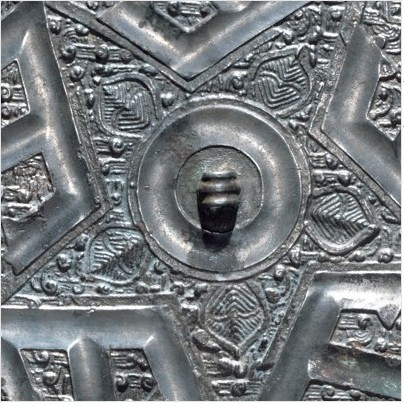 圓形,弦鈕。凹面環帶一周。主題紋飾以羽狀地紋與主紋組合而成,主紋為五個傾斜的山字左旋排列,中間配五瓣花葉;傾斜的五山之間空隙形成一個五角星。素卷緣。此鏡水銀古,構圖清秀精緻,品相佳。歷來所見,山字鏡以四山為多,圖案變化多樣。五山鏡存世量遠遠少於四山鏡。