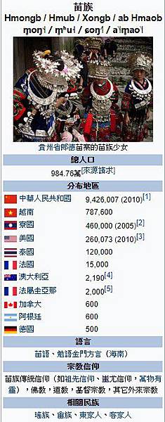 苗族(苗語湘西方言:Ghaob Xongb;黔東方言:Hmub;川黔滇方言:Mongb;泰語:แม้ว / ม้ง;越南語:H'mông),是發源於中國東部的國際性民族,主要聚居於中國華南及東南亞。根據2010年人口普查,中國大陸有苗族9,426,007人,占苗族總人口的70%以上,為中國第五大民族[1]。在越南和寮國名為赫蒙族(越南語:H'mông)[註 1],人口78萬7604人,列第8位[來源請求]。美國也有大約27萬人的苗族裔美國人[6]。
