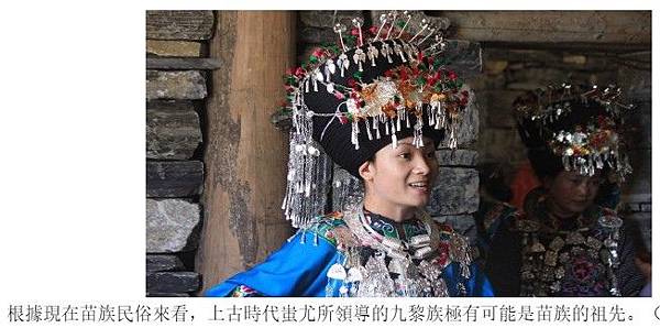 根據各地所流傳有關苗族歷史的傳說,他們的起源都可以上溯至炎黃時代。一般認為九黎民族的先祖蚩尤也是神農的後裔 苗族 - 維基百科,自由的百科全書 http://tinyurl.com/yydpha4v