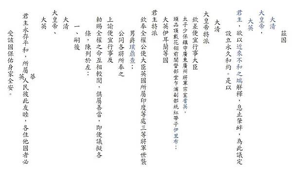 《南京條約》(英語:Treaty of Nanking[2]),又稱《江寧條約》,大清朝廷稱之為「萬年和約」[3],是大清(中國)首個因對歐美國家戰敗而簽之條約。滿清道光二十二年(1842年),大清在對大英的第一次鴉片戰爭中戰敗。雙方代表在南京靜海寺談判並在泊於南京下關江面的英軍旗艦汗華囇號上簽署《南京條約》,以確切文件達成開放通商,並且清朝永久割讓香港島給予大不列顛及愛爾蘭聯合王國(大英,英國)。