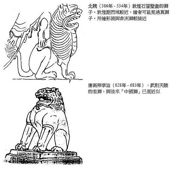 獅從西域來。唐代高僧慧琳說:『狻猊即獅子也,出西域』,明代科學家李時珍也說:『獅子出西域諸國』,晚清學者文廷式論證更詳:『狻猊即獅子,非中國獸也』。三代之前若果有之,則詩、書記載必不稱犀象而獨遺獅子。《後漢書》卷三有最早的獅子文獻記錄:漢章帝章和元年(公元87),月氏國獻獅子;二年(公元88),安息國獻獅子。隨後歷代均有貢獅記錄,直到清康熙十七年(公元1678),葡萄牙使臣本篤貢非洲獅爲止。 http://tinyurl.com/yyd8pvmy