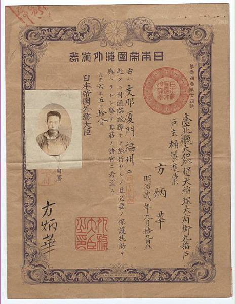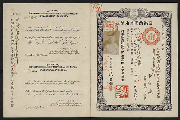 從此份日本帝國海外旅券展品可見,旅券上詳細記載旅券擁有者之戶籍、個人資訊,以及敘明渡航理由;並記有「該氏名因為探親前往清國福州 任憑旅行無阻如有緊要事即請沿途各官加意照料善為保佑」之說明,並有英文及法文譯文。日本帝國海外旅券(明治39年) - 斯土斯民-臺灣的故事 http://tinyurl.com/yyp4oz7m