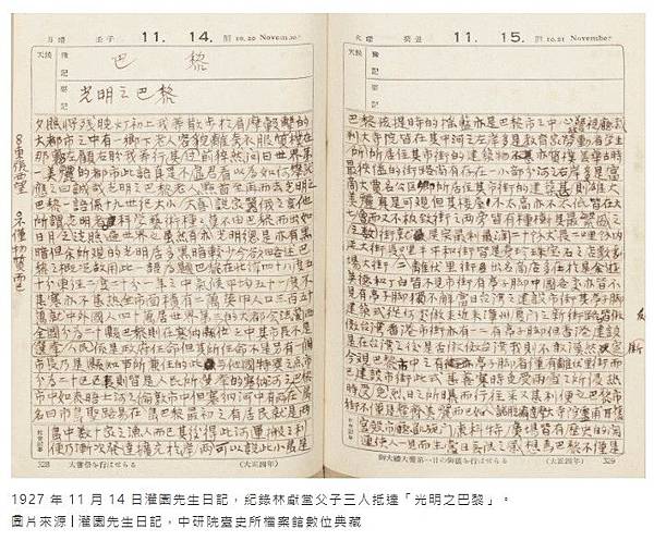 1927 年 11 月 14 日灌園先生日記,紀錄林獻堂父子三人抵達「光明之巴黎...