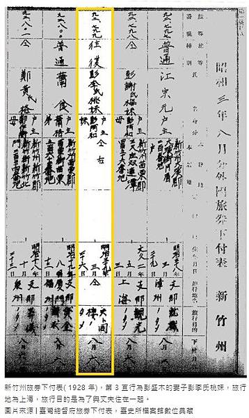 新竹州旅券下付表( 1928 年),第 3 直行為彭盛木的妻子彭李氏桃妹,旅行地為上海,旅行目的是為了與丈夫住在一起。