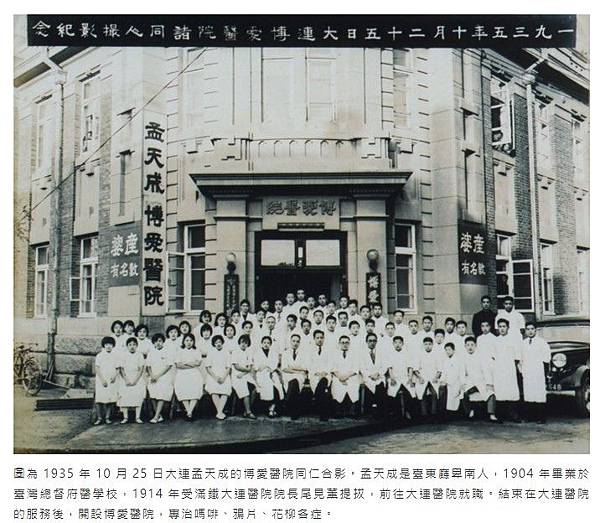 圖為 1935 年 10 月 25 日大連孟天成的博愛醫院同仁合影。孟天成是臺東...