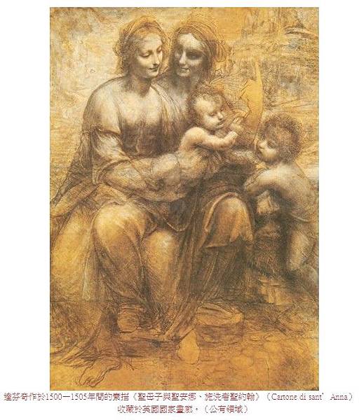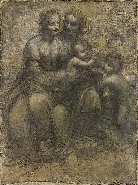 達芬奇作於1500—1505年間的素描《聖母子與聖安娜、施洗者聖約翰》(Cartone di sant'Anna),收藏於英國國家畫廊。(公有領域)