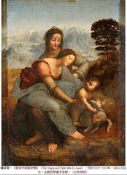 達芬奇,《聖母子與聖安娜》(The Virgin and Child with St. Anne),作於1510—1513年,168×130公分,法國巴黎盧浮宮藏。(公有領域)