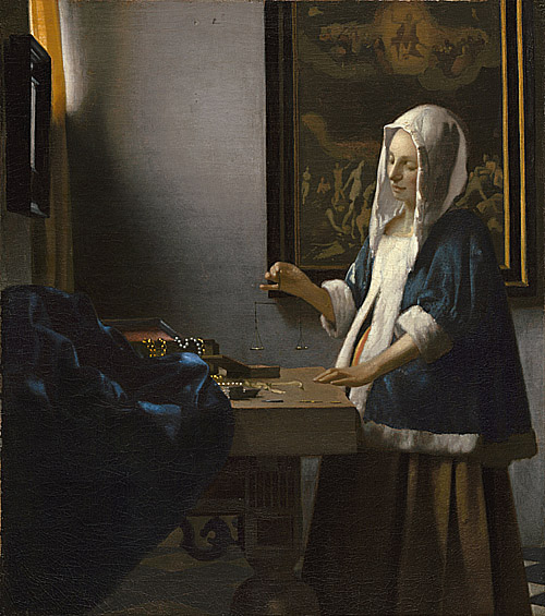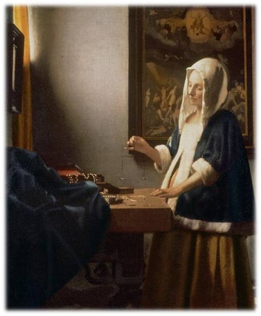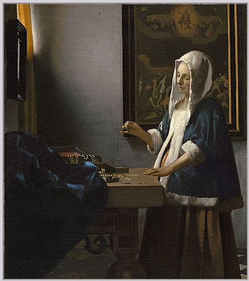 維梅爾利用虛空這框架,描繪了一幅看似荷蘭婦女用天平秤量珠寶價值的風俗畫。其實,婦人面前的天平上根本空無一物,她並非在衡量珠寶的價值,而是凝視暗喻最後的審判的天平,冥想自己的人生。https://is.gd/33Y9Ie