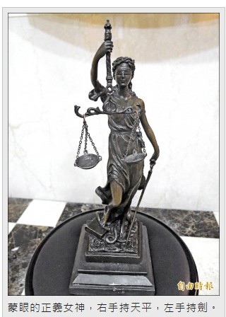 蒙眼的正義女神,右手持天平,左手持劍。(記者張文川攝)