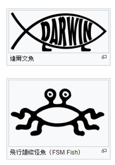 飛行麵條怪物的徽標——「飛行麵條怪魚(FSM Fish)」,是對基督教重要標誌之一的耶穌魚的惡搞。