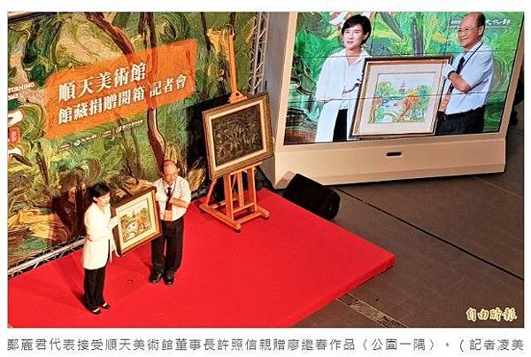 順天美術館由順天堂藥廠創辦人許鴻源博士夫人許林碖女士在1993年創立,擁有許博士家族自1979年起歷經兩代長達半世紀,從日治時期到戰後的台灣美術收藏逾600件。許鴻源博士之子、順天美術館董事長許照信伉儷、順天美術館館長陳飛龍也特別返台出席開箱儀式,對於將所有館藏捐贈政府,許照信說,因為他對台灣有信心,對台灣人也有信心。陳飛龍則以「牽手」比喻,要「把愛的故事牽出去」。 652件珍貴典藏捐政府 順天美術館董事長:因為對台灣有信心 - 自由娛樂 http://tinyurl.com/yxjw4lpx