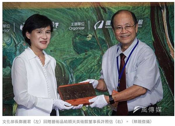 文化部長鄭麗君(左)回贈藝術品給順天美術館董事長許照信(右)。(蔡親傑攝)