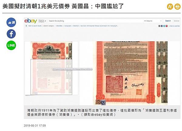 分享美國擬討清朝1兆美元債券 黃國昌:中國尷尬了到Facebook 分享美國擬討清朝1兆美元債券 黃國昌:中國尷尬了到Line