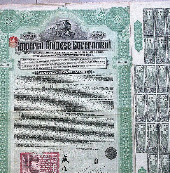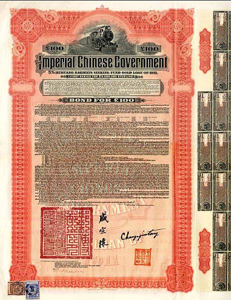 清朝政府為了興建漢口到四川的鐵路,便於1911年籌資發行湖廣鐵路債券。但1949年成立的中華人民共和國政權從未承認這些債務