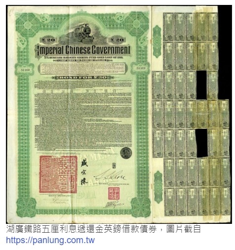 湖廣鐵路五厘利息遞還金英鎊借款債券,圖片截自 https://panlung.com.tw