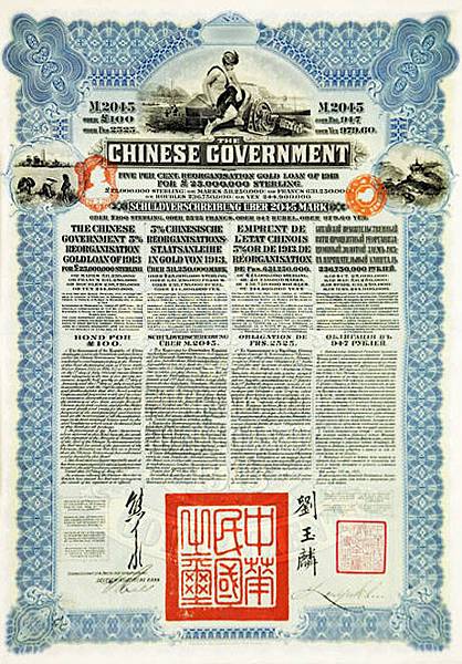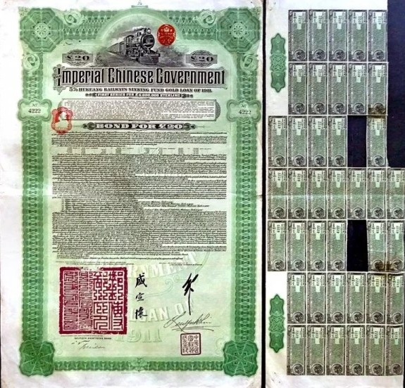 這些債券是「湖廣鐵路五厘利息遞還金英鎊借款債券」,當時中國清朝政府為鎮壓南方革命,欲修建湖北、湖南境內的湖廣鐵路,因此向國際籌措借貸,當時德、英、法、美國提供借款,借貸契約以清朝大臣盛宣懷為借方代表,貸方銀行在1911年以清朝政府名義發行借款債券600萬今英鎊,但1938年中方停付債券利息,1951年本金到期時也未付款。中華民國、中華人民共和國均不承認債務。