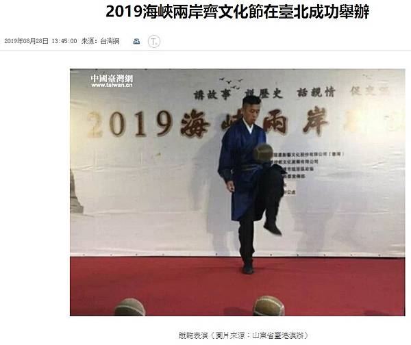 台灣網8月28日訊 日前,2019海峽兩岸齊文化節在臺北市信義區公民會館舉辦,節會以“講故事、説歷史、話親情、促交流”為主題,重點圍繞姜太公、管仲、蹴鞠、稷下學宮、姓氏圖騰、高青糖畫等,深入挖掘闡發齊文化內涵,以豐富多彩的形式傳播和弘揚齊文化,打造齊文化品牌,讓廣大臺灣同胞近距離感受齊文化的獨特魅力,營造“弘揚齊文化、兩岸一家親”的和諧氛圍,推動淄博與臺灣兩地文化藝術交流與産業合作。