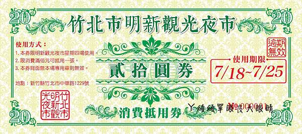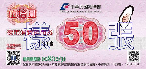 從樣張的圖片可以看到,此次夜市消費抵用券的正面除了寫有面額50元之外,還註明使用期限、注意事項。最特別的是還放上QR code,方便使用者找到最近的夜市前往消費。樣張的背面則有發券旅宿業者、收券攤商、收券管理委員會的蓋章處,並附註詳細的使用說明。