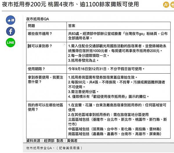 交通部擴大秋冬國民旅遊獎勵計畫,經濟部將補助自由行住宿的旅客每房200元的夜市消費抵用券,使用範圍遍及全台合法登記的73個夜市,引發熱議。經濟部中部辦公室主任郭坤明表示,為鼓勵消費,抵用劵規劃原則限於旅宿當地區域縣市政府登記或列管有案的夜市使用。其中北區(基隆市、台北市、新北市、桃園市、新竹縣市)、中區(苗栗縣、台中市、彰化縣、南投縣、雲林縣)、南區(嘉義縣市、台南市、高雄市、屏東縣)不可跨區域使用,但宜蘭縣、花蓮縣、台東縣及離島縣市旅遊則不受限制。也就是說,到宜花東及離島旅遊,不僅領得到抵用劵,並且年底之前全台各地都可使用。
