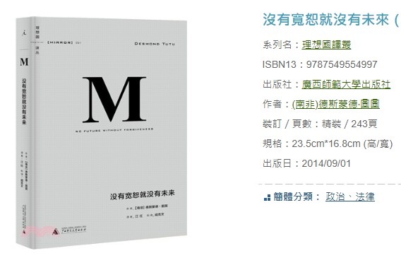 「為什麼高鐵也會坐到鐵腿?」「為什麼三個小時的年夜飯吃完身心俱疲?」「為什麼發完紅包口袋空空、還暗地被「青」了一下?」這麼多椎心頓足的OS年年上演,人生,是一場不斷冒險的旅程,誰說野狼不會遇上貓呢?還不趕快先惡補生存交戰閱讀指南,跳脫框框,能讓你的視野更開闊,夢想不遠,廢柴也能出頭天!今天,在這兒跟各位推薦一本好書:沒有寬恕就沒有未來:屠圖主教與曼德拉的真相和解之路