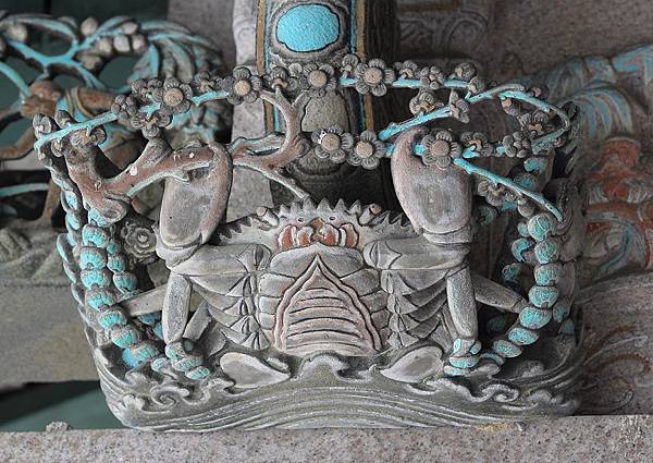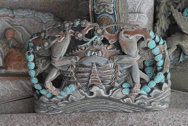 有趣的是這兩隻螃蟹的造型,匠師將它們設計成為價格高昂的「紅蟳」,在「台灣府誌」中即有記載「蟳仔」的暱稱,蟳是價格高昂的滋補珍品,根據民間說法,吃紅蟳對於少年轉骨、產婦坐月子、補腦筋衰弱、男人敗腎、中年禿頭、老人眼濁、畏寒怕冷等症狀均有療效,有孕者吃紅蟳則可使胎兒更強健。蟳除了在文化上有著吉祥的寓意之外,也與台灣民眾的生活已產生密不可分的關係。 https://is.gd/USNFwX