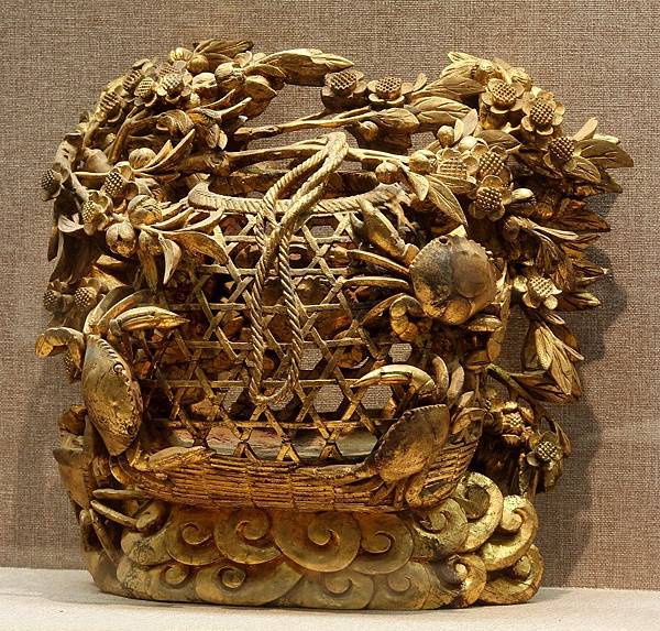 當您進入本館人類文化廳二樓的漢人的心靈生活展示區時,最吸引人目光的就是懸吊在空中的萬福宮建築。若您仔細觀察,在萬福宮三川殿上的藻井旁的斗座,匠師巧心的將其設計成螃蟹的造型,兩隻螃蟹的大螯各夾著魚與鱸鰻,在整個萬福宮當中獨顯一格,但會有螃蟹水族生物的出現,其實有著相當有趣的意涵。