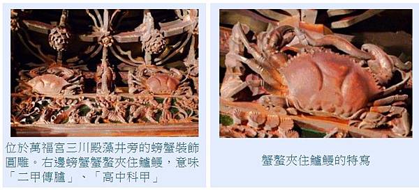 位於萬福宮三川殿藻井旁的螃蟹裝飾圓雕。右邊螃蟹蟹螯夾住鱸鰻,意味「二甲傳臚」、「高中科甲」