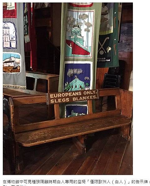 在博物館中可見種族隔離時期白人專用的座椅「僅限歐洲人(白人)」的告示牌(攝影:黃炤愷)