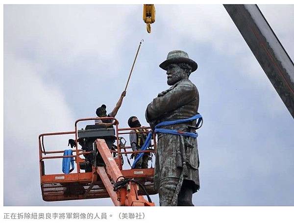 正在拆除紐奧良李將軍銅像的人員。(美聯社)