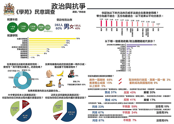 至於《學苑》的「政治與抗爭」民意調查則訪問了467位港大學生,當中社會科學學院受訪者佔19%。關於受訪者的政治取向,有61%認為自己屬「泛民主派」,有9%認為自己屬「建制派」,其餘為「兩者皆非」。至於最適合在香港使用的示威手法頭3位,分別是集會 (3.82分) 、遊行 (3.8分) 、及靜坐 (3.46分) 。