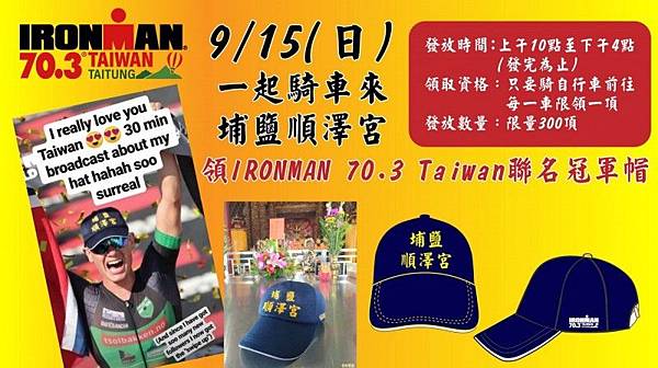 台灣人的驕傲!供奉玄天上帝的彰化縣埔鹽鄉順澤宮,廟方推出「進香帽」的宮帽,因為挪威3鐵選手艾登(Gustav Iden)頭戴這頂宮帽,今年9月8日奪下在法國尼斯舉辦世錦賽的3鐵世界冠軍,冠軍神帽之名一夕間在全球網路世界爆紅 https://is.gd/pVY6dS