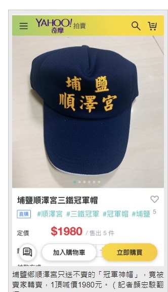 把「神帽」拿到拍賣網站販售,一頂竟賣到1980元,上架不到1小時就賣出超過5頂,賣家靠著「神明」爽賺萬元,令順澤宮的信徒氣憤不已。靠神明發大財行為,令人不齒,一定會遭天遣。廟方表示,對於民眾拿到網路上販售,他們感到無奈,現在一人只能預訂1頂,就算今天預訂,要到10月中才能拿到。 https://is.gd/C4JkPV