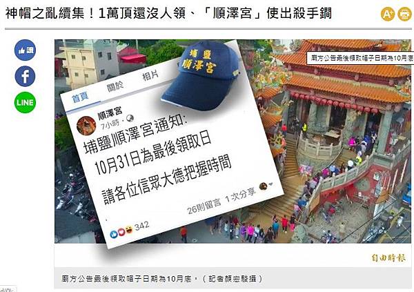 神帽之亂續集!1萬頂還沒人領、「順澤宮」使出殺手鐧 - 生活 - 自由時報電子報